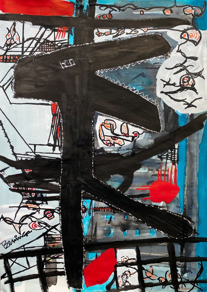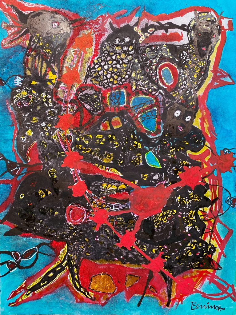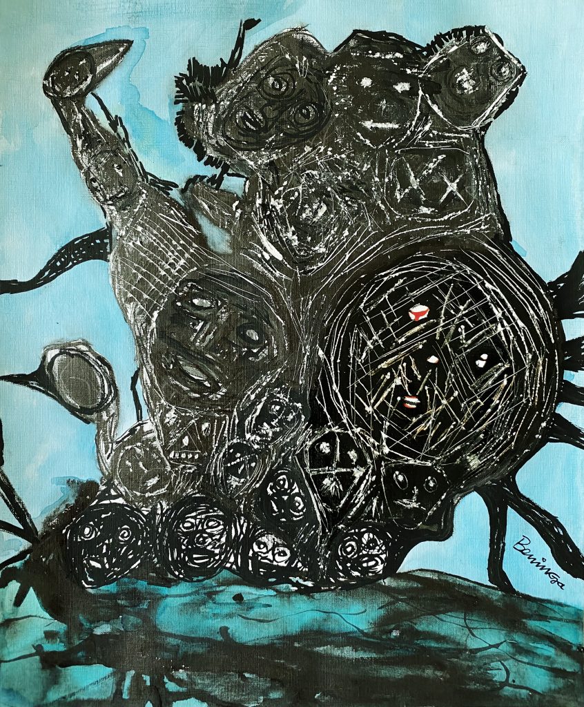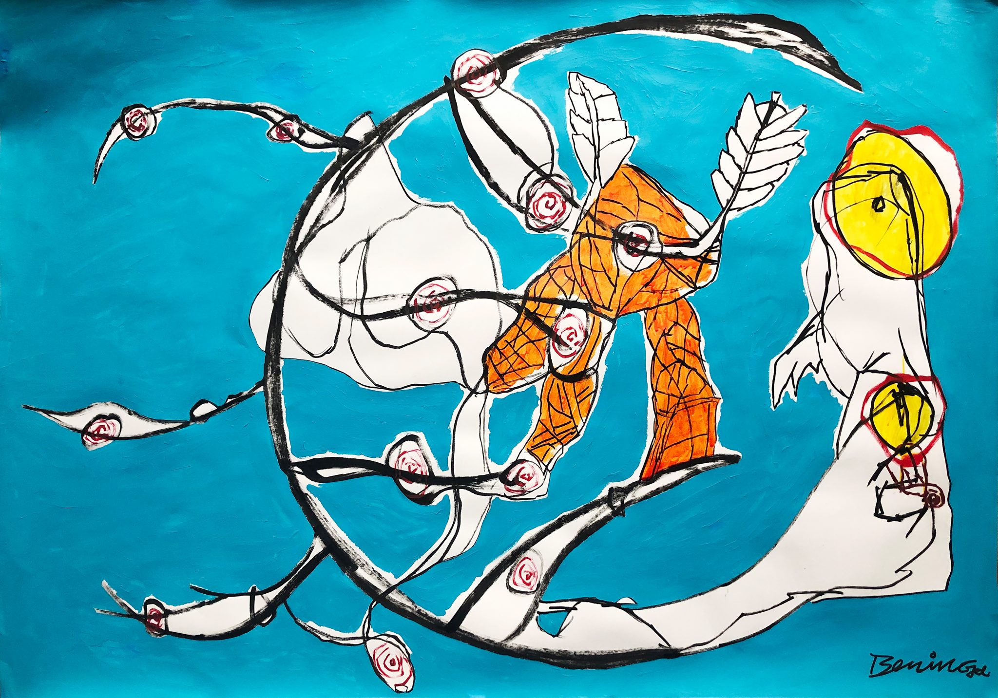 Die Bilder von Leo erkennt man sofort durch die feine Einrahmung mit schwarzem Passepartout. Seine Werke sind ein dichtes Geflecht: Hier treffen gestische Malerei, präzise Zeichnung und Collage direkt aufeinander und bilden eine neue, rätselhafte Realität. Beninga arbeitet viel mit poetischen Texten, dadurch sind die Titel seiner Bilder sehr kreativ – mit ungewöhnlichen Kombinationen von Wörtern, die ein bisweilen befremdliches Gefühl hervorrufen, jedoch das Thema des Werkes treffend beschreiben.