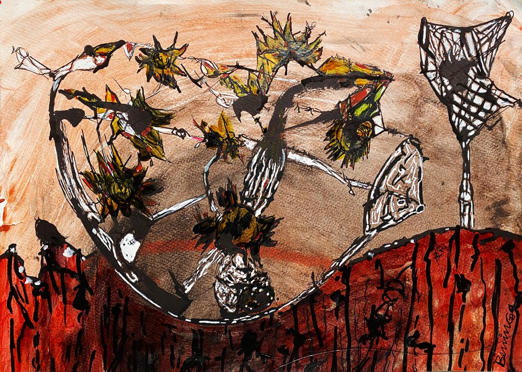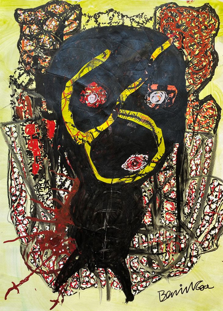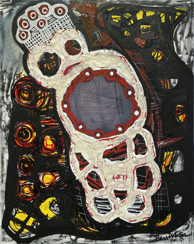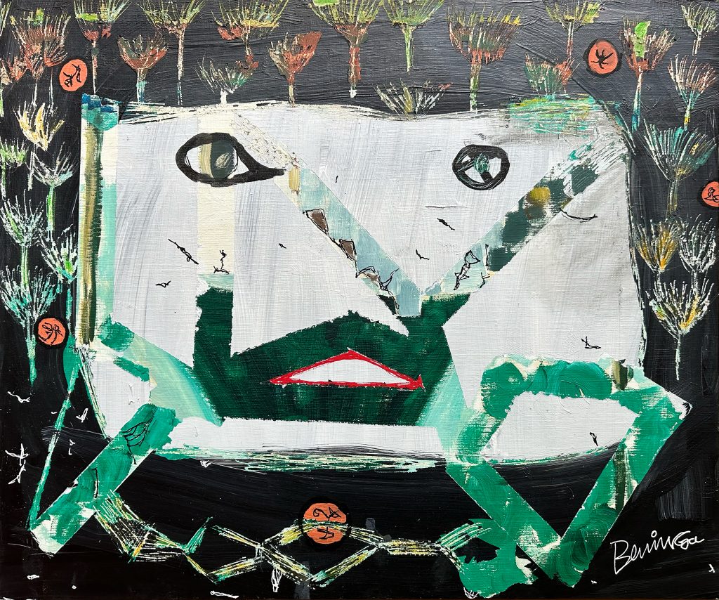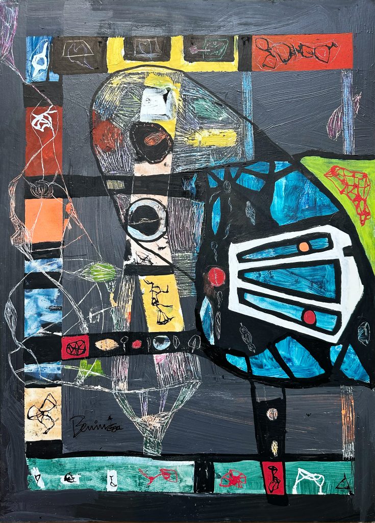 Die Bilder von Leo erkennt man sofort durch die feine Einrahmung mit schwarzem Passepartout. Seine Werke sind ein dichtes Geflecht: Hier treffen gestische Malerei, präzise Zeichnung und Collage direkt aufeinander und bilden eine neue, rätselhafte Realität. Beninga arbeitet viel mit poetischen Texten, dadurch sind die Titel seiner Bilder sehr kreativ – mit ungewöhnlichen Kombinationen von Wörtern, die ein bisweilen befremdliches Gefühl hervorrufen, jedoch das Thema des Werkes treffend beschreiben.