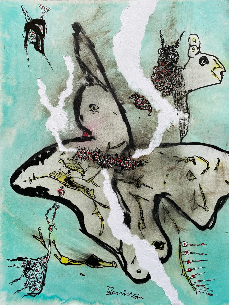 Der Traum, der Vogel, die Nacht und der Keller Décollage, Grattage und Acryl auf Hartfaser 70,2 × 50,4 cm 2025 840 €