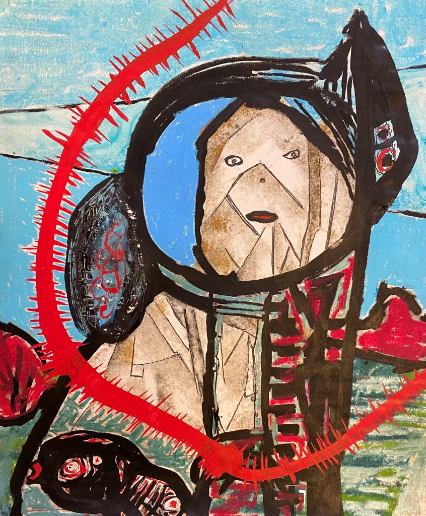 Im Spiegel Acryl, Tusche, Wachsund Buntstift auf Papier 39 × 32,2 cm 2022 560 €