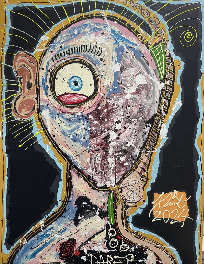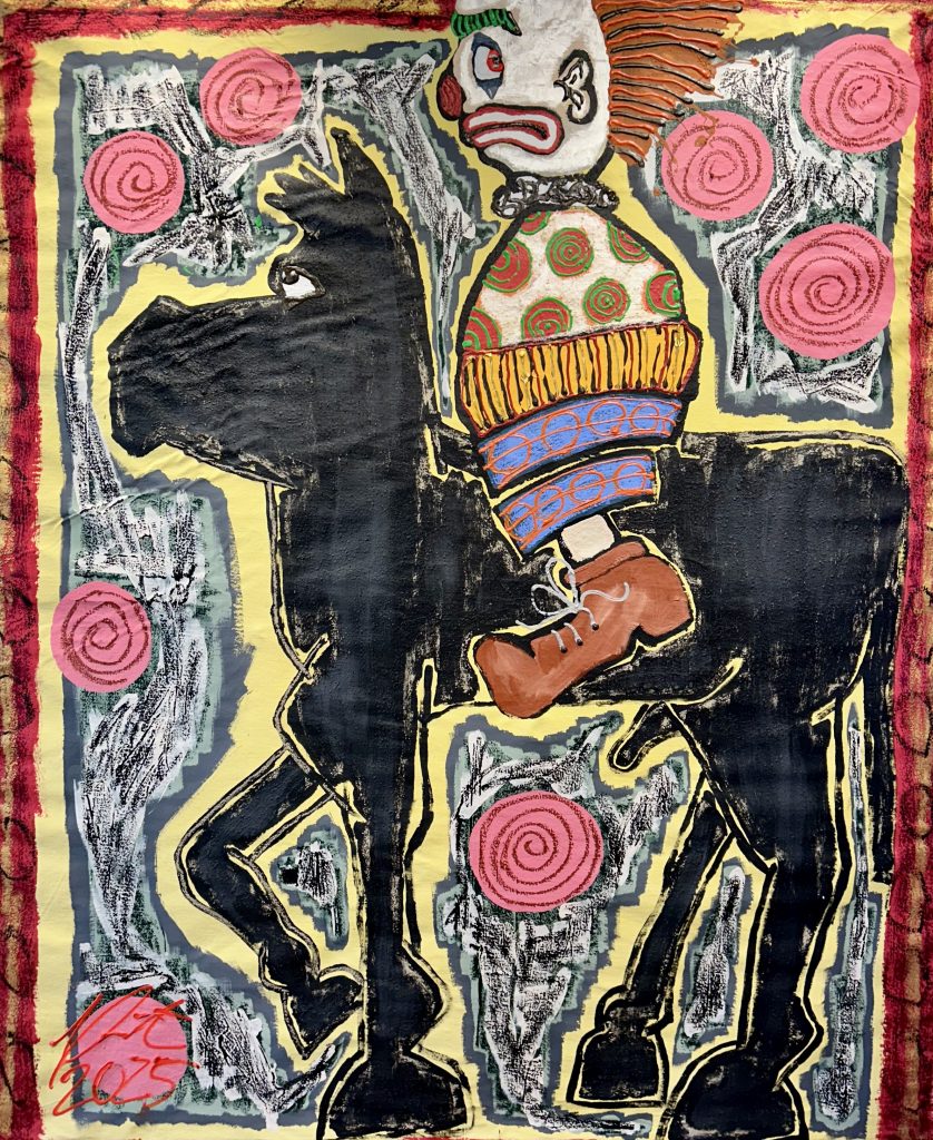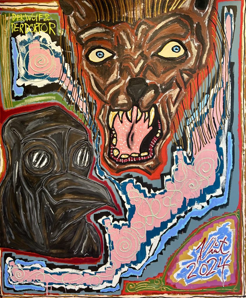 Seine Malerei ist eine intensive Auseinandersetzung mit Materialität und dem Prozess des Malens. Viel Farbe auf der Leinwand und manchmal sogar Stoff oder Modellierschaum: Seine intuitive Motivauswahl und die experimentelle Beziehung zum Material spiegeln seine 21 Lebensjahre wider. Mutig und expressiv arbeitet er in schnellem Tempo. Er malt Menschen und Tiere, die grotesk verzerrt sind. Große Augen, riesige Münder und deformierte Gliedmaßen dominieren Werke wie „Kurzes Pony“ oder „Zwei Brüder“.